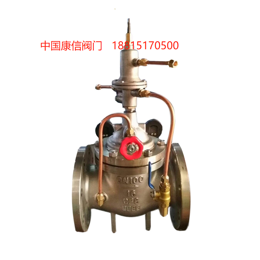 当主阀进出口间压差变化时,接管A与接管B间压差发生变化,此变导阀的开度。压差大时导阀开度大,控制室通过C管的下泄水量增大,主阀控制室压力下降,主阀开度增大,主阀进出口间压差变小。反之,若主阀进出口间压差变小,则导阀开度变小,主阀控制室压力上升,推动主阀开度减小而使主阀压差增大。这种负反馈作用使主阀进出口间压差稳定在社顶值上。设定针阀开度和导阀弹簧压力可设定主阀进出口间压差。