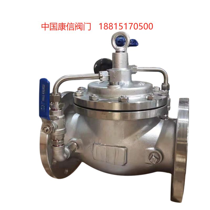当阀门从阀前端给水时,水通过微型过滤器、针型阀、单向阀进入主阀控制室,再经过球阀排水至下游。因为针型阀开度小于球阀开度,即主阀控制室的排水速度大于进水速度,因此控制室压力降低,作用于主阀盘下端的阀前压力打开主阀向下游供水。当管道停止供水时,若下游水开始回流,一部分回流水经球阀进入主控制室,由于单向阀作用,回流水不能从主控制室流出,引起主控制室逐渐升压,缓缓关闭主阀。
